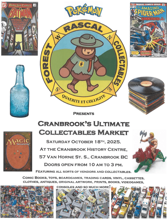 The collectables show that is definitely not on the same weekend as Calgary Comicon this time! Forest Rascal Collectables is thrilled to be putting on the third Cranbrook Ultimate Collectables Market. Our April show featured a larger venue in our new home at the Cranbrook History Centre. What is new about the fall show you ask? MORE TABLES! Why does that deserve all caps, you are wondering? Because it means MORE VENDORS!, MORE COLLECTABLES! & MORE VARIATY! This show just keeps getting bigger and better. Save the date and we will see you there!